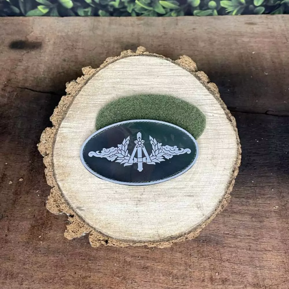 Os distintivos plastificados ou ( emborrachados como são conhecidos) são confeccionados em PVC, pelo processo de moldagem a quente, na cor cinza, sobre uma elipse suporte imitando tecido de padronagem camuflada e aplicado por meio de fecho de contato na cor verde.