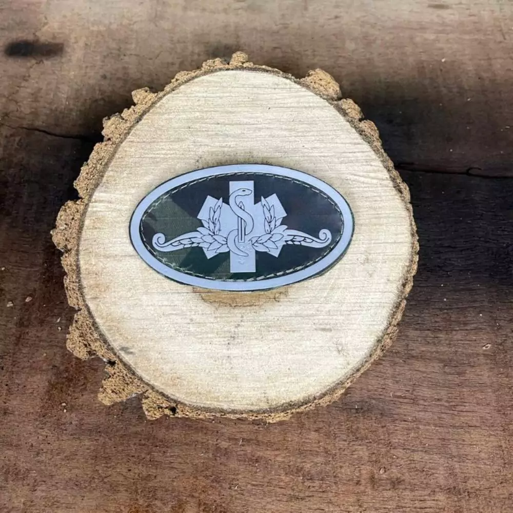 Os distintivos plastificados ou ( emborrachados como são conhecidos) são confeccionados em PVC, pelo processo de moldagem a quente, na cor cinza, sobre uma elipse suporte imitando tecido de padronagem camuflada e aplicado por meio de fecho de contato na cor verde.